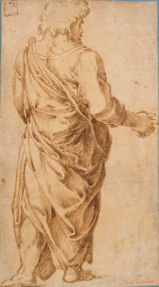Saint Paul’s name was also formerly given to our drawing, a fact which confirms the fascination this monumental figure exercised, and still does, as he seems to incarnate by himself alone the indomitable steadfastness of Christian dogma. This sheet, realized by an artist who certainly was able to gain access to the Pope’s private apartments while the work was still in process, was produced shortly after the fresco was finished. In fact, it differs too much from the engraving drawn from the Dispute by Giorgio Mantovano Ghisi in 1552 for that to have been used. Its surprisingly large format also leads to the same conclusion.