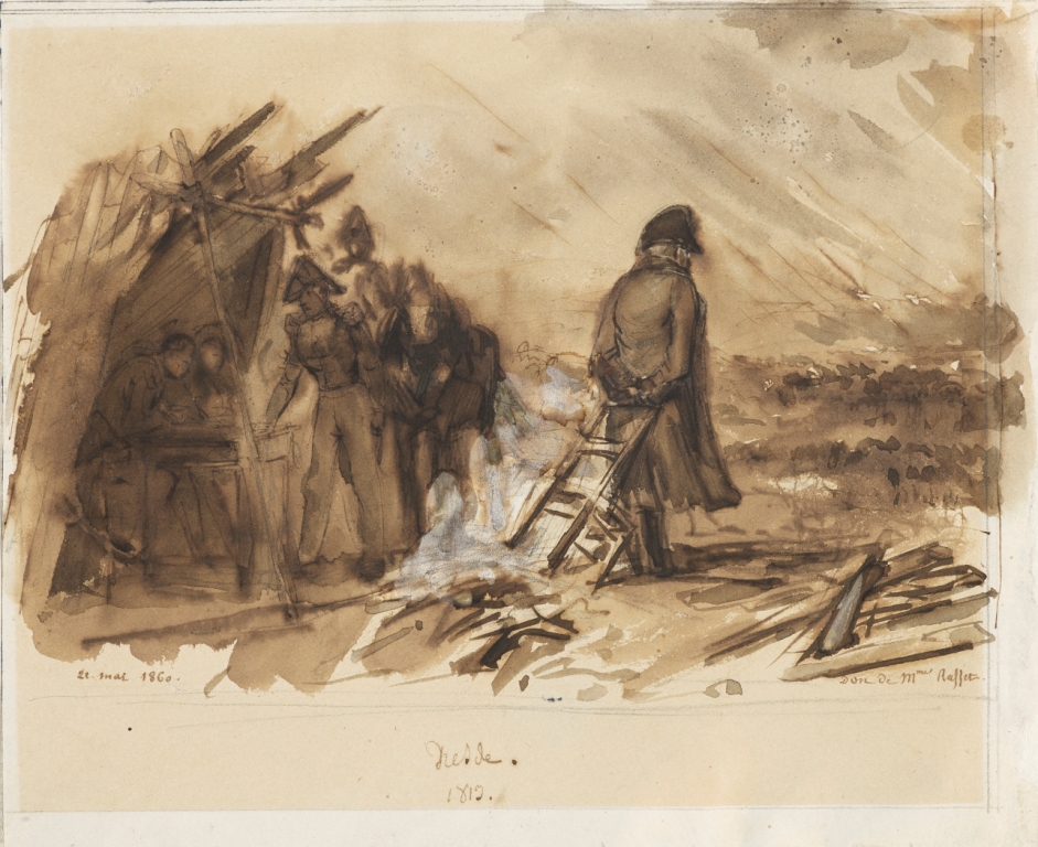 A preparatory study to this lithograph, our drawing proves that the artist had envisaged dramatizing the scene even more, while making it more trivial and situating it more precisely in Dresden in the rain in the early morning on the second day of battle, August 27th, 1813. Although one finds the hut with the camp aides and the officer as they will appear in the lithograph, logically reversed from the plate for L’Artiste, everything else is different. Leaning on his chair, the Emperor here is seen from the back observing troop maneuvers on the plain. His immediately recognizable slightly curved silhouette does not in the least make it possible to guess the thoughts which absorb him and make him ignore the storm which descends on the battle field.