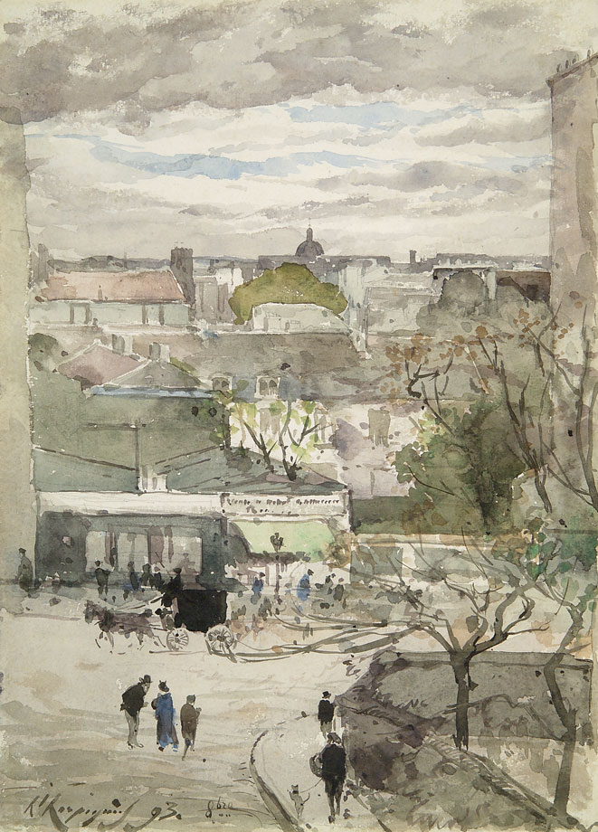 The view, situated slightly below the viewer, is dominated by a washed light and a shifting sky animated by greys and blues. It thus differs from previous city views which have greater contrasts and are more structured, such as Saint-Germain Boulevard of 1887 (Paris, Petit Palais Museum) or the View from a Window at No. 6, rue Furstenberg of 1882 (Private Collection).