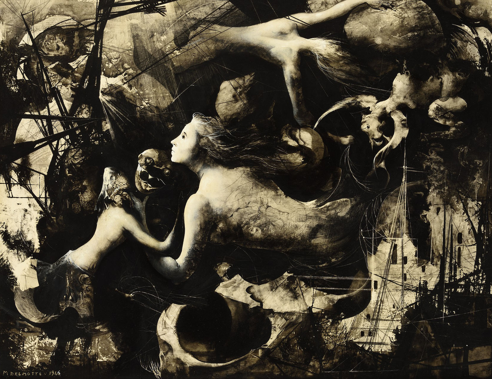 Much more complex and polysemic, our panel stands out from the marvellous colorism of Delmotte’s work by its assumed monochromatics which contrast even with his pictures where a single shade dominates, in line with the Abstract Composition of 1953 (ill. 1). Our work is like an immense India ink drawing, reminiscent of seascapes “in the manner of an engraving” after Willem Van de Velde, or else of a black and white photograph of a transfigured newspaper. The convex elastic space filled with figures and ductile forms with undefined contours which wrap around a chimerical creature with the angelic face of a young girl – the only face in the picture – whose back is tattooed with tangled bodies. Out of this rhythmical turmoil emerges a combat – if not a ballet – between light and shadows or obscurity, between beauty and ugliness of monsters worthy of Hieronymus Bosch, between curves and straight lines, between surface dullness and brilliance. Mountain peaks become waves, castles melt into the fog, lines which cross form electric poles here and sailboat masts there.