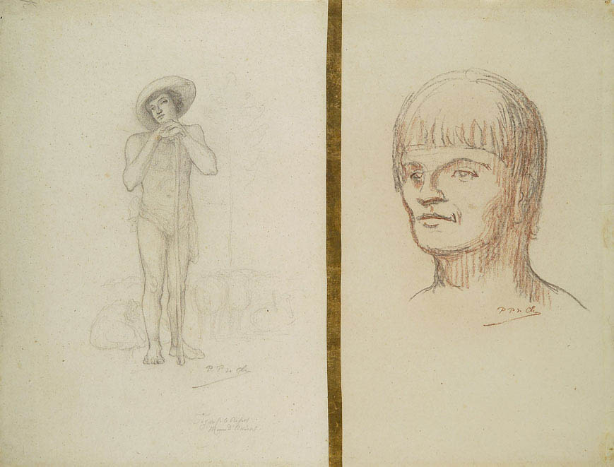 Le premier motif est celui d’un jeune berger : le trait est fin et soigné, les contours soigneusement ombrés. Le sujet est tout à fait identifiable car il s’agit d’une esquisse préparatoire au Repos, grande fresque murale citée plus haut, réalisée pour le Musée de Picardie à Amiens. En bas à gauche de ce premier feuillet, on peut lire « Figure pour le Repos – Musée d’Amiens ». Dans la composition finale, notre berger a perdu son bâton et se trouve appuyé sur un camarade mais l’artiste a conservé pour ce personnage la même pose et la même allure. On sent bien ici la rigueur académique qui a caractérisé les premiers travaux monumentaux de Puvis de Chavannes, et le style des années 1860.