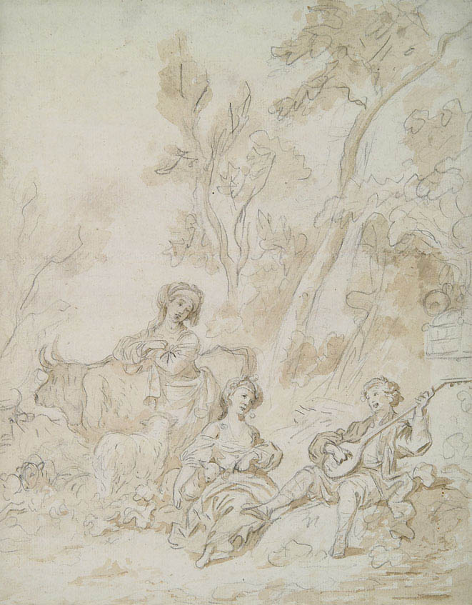 Ce dessin au lavis de bistre représente, dans un cadre de végétation, un jeune berger joueur de guitare qu’écoutent deux jeunes femmes souriantes. L’une est assise et caresse un agneau endormi, l’autre se tient debout à coté d’une vache.