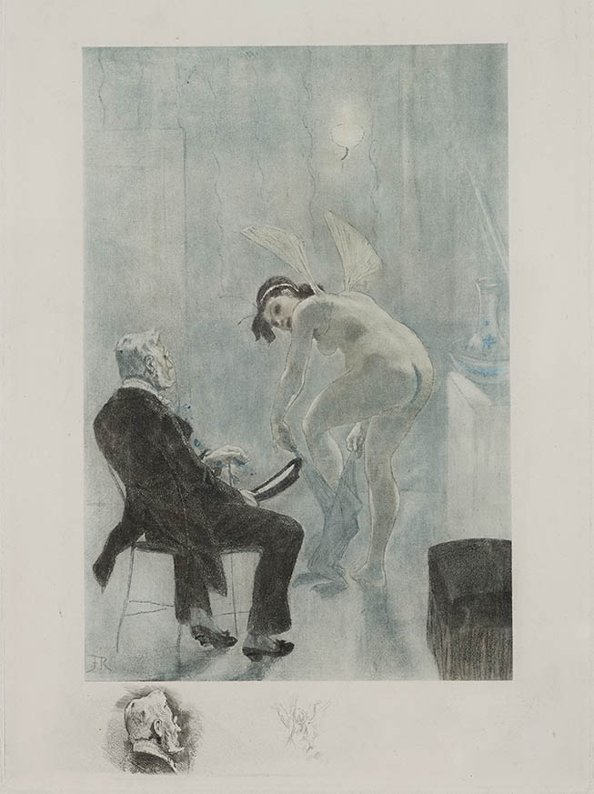 La feuille monochrome que nous présentons est le dessin préparatoire au croquis numéro 77, réalisé à la pierre noire et au fusain. La scène se passe dans les coulisses d’un théâtre, thème de prédilection de Rops. Une jeune femme est en train d’enfiler son maillot de corps sous le regard lourd d’un homme d’un certain âge, mais étonnamment coquet. L’actrice porte déjà les ailes de son costume et un serre-tête orné d’antennes : elle figure probablement un papillon de nuit, image qui était alors employée pour désigner les prostituées. C’est l’un de ces « demi-nus modernes » chers à Rops qu’il recherche dans les rues de Paris. Dans une lettre célèbre à Noilly, il écrit :