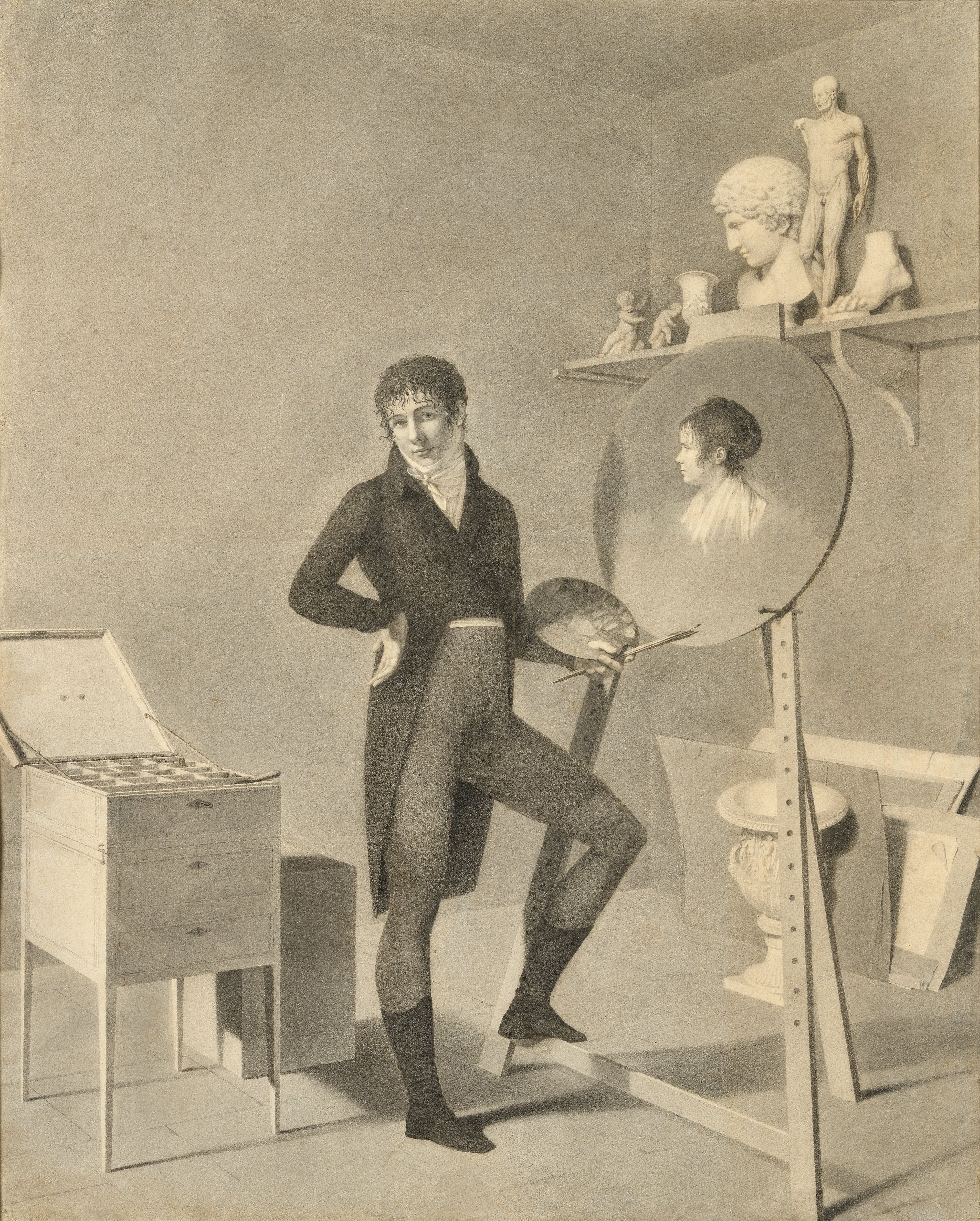 Dans un intérieur d’atelier d’artiste, un peintre pose fièrement devant son chevalet. La pièce est très épurée, caractéristique de la représentation des ateliers à la fin du XVIIIe siècle (ill. 1). Le peintre, représenté en pied, est placé entre ses deux attributs : une boîte de peinture à gauche et un chevalet à droite derrière lequel sont disposés des objets qui se rapportent à son activité, dont plusieurs cartons à dessins contre le mur retenus par un vase Médicis à décor sculpté. Dans le coin de la pièce, en haut à droite de la composition apparaît une étagère sur laquelle sont juxtaposés les modèles classiques d’étude : un fragment en marbre représentant le pied de Mercure, un écorché, figure essentielle permettant l’exacte reproduction anatomique, une sculpture du profil d’Antinoüs, canon antique de beauté par excellence, ou encore deux petites sculptures d’amours, traduisant la culture de l’artiste.