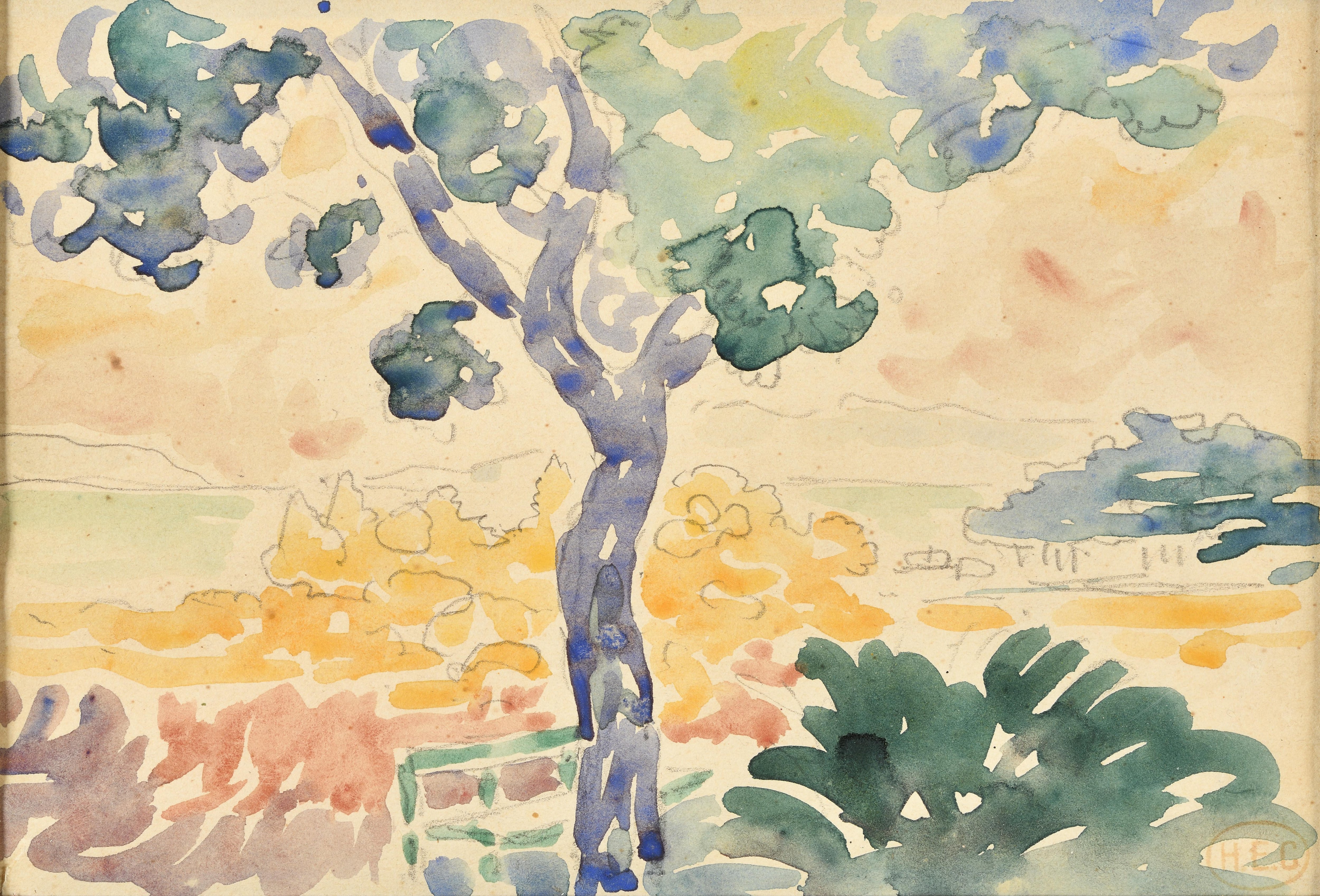 Comme une terre promise, Cross trouve dans ces paysages la douceur, l’isolement et la tranquillité propice à la création. La nature qui s’offre à la vue du peintre apparaît comme idyllique, un refuge soigneusement choisi contre le bruit assourdissant des grandes villes. Dans notre paysage inondé de soleil s’apparentant à une Arcadie, un majestueux pin trône au centre de la composition. Exemptée de toute connotation historique, l’œuvre fait preuve d’un lyrisme puissant grâce à un travail poussé sur la couleur permettant de transmettre une vision panthéiste de la nature.