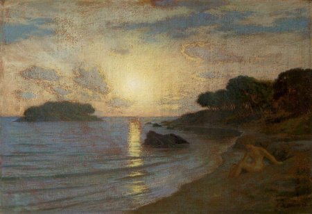L’artiste ne cherche pas à décrire ; on est à Léoube ou à l’Estagnol (sur la côte d’Azur, près du Lavandou), comme on pourrait être dans un utopique lieu antique, calme et méditatif. L’attitude de la jeune femme le rappelle, qui s’offre à voir mais détourne la tête, inconsciente du regard extérieur. La plume du critique Gustave Soulier, qui préface en 1894 une exposition de Ménard, semble bien résumer notre œuvre : le peintre dévoile ici une de « ces visions de nature pacifiée, baignée d’aube ou de crépuscule, où l’âme semble se retremper dans la candeur des aurores, et aspirer l’onction qui découle des soirs d’or. »