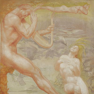 La légèreté émanant de la composition rapproche la scène d’une échappée poétique proche de la rêverie, issue de l’imaginaire de l’artiste. L’effort est rendu souple et délicat par ces jeux de courbes et contre-courbes évoquant grâce et flottement, aux antipodes de l’idée de puissance annoncée par le sujet. Les figures énigmatiques laissées en réserve, sont simplement cernées car au-delà de l’identité des modèles, l’artiste s’emploie à retranscrire l’idée d’une dynamique générale. L’ensemble forme une vague puissante accentuée par le traitement des figures athlétiques inspirées de la sculpture grecque sur lesquelles repose la figure principale. Au milieu de ces couleurs pastel, notons également l’ingénieuse présence de roses esquissées, fleurs favorites de l’artiste placées non hasardeusement au centre de la composition.