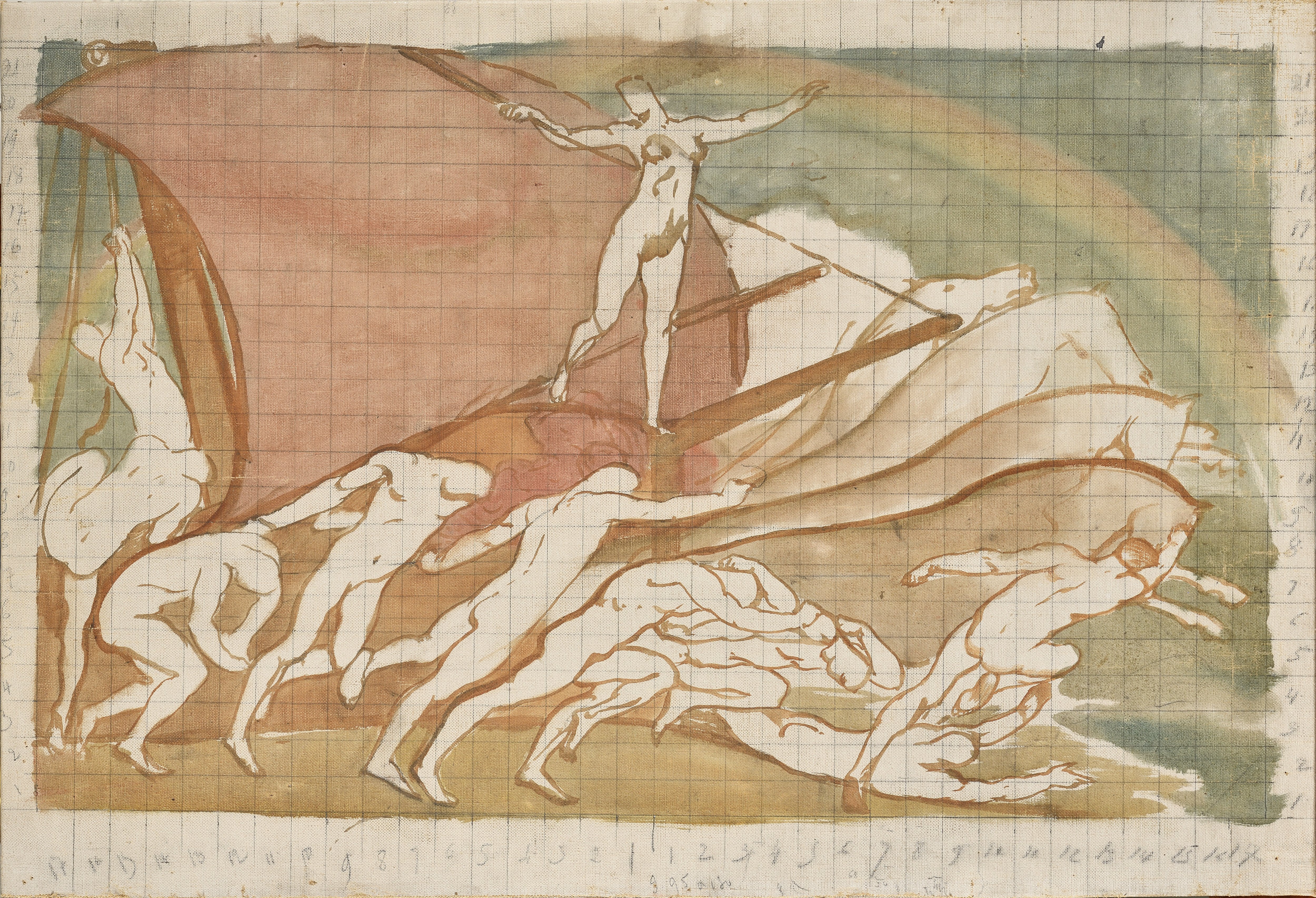 Indispensable au processus de création, l’esquisse permet de rendre compte des différentes étapes de réflexion. Le quadrillage tracé au crayon sur le fond de notre toile résulte de la technique de la mise au carreau, permettant de reproduire l’œuvre finale aux dimensions monumentales.