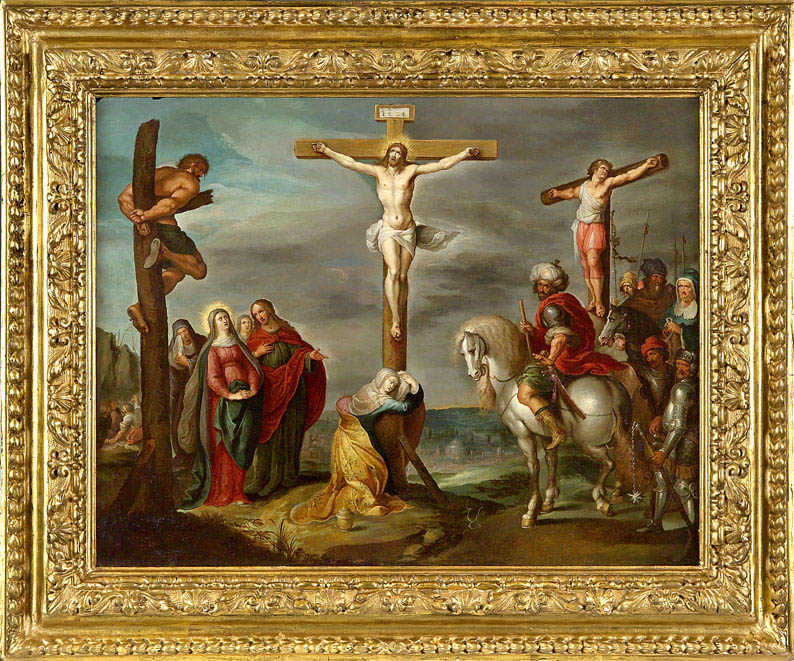 C’est à l’extrême vivacité de la gamme chromatique que l’on reconnait la palette d’Hans Jordaens III. En outre, le traitement des chevaux est typique de l’artiste qui va jusqu’à la stylisation des formes. En revanche, les corps du Christ et du deuxième larron, comme la grande expressivité des personnages simiesque du groupe de droite, suggèrent la main de Frans Francken III.