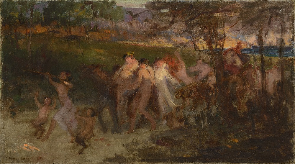 Dans une verve toute rubénienne, Magnan-Bernard a dressé ici d’un pinceau suggestif le cortège de Bacchus, qui a quitté les abords d’une mer bleu de Prusse pour progresser entre les pins. La palette est sombre, les terres d’ombres et le vert émeraude dominent, relevés d’éclats de lumière magnifiant des chairs aux tons chauds. La pâte souple est étendue d’une main dynamique, la matière est striée par les traces de pinceau.