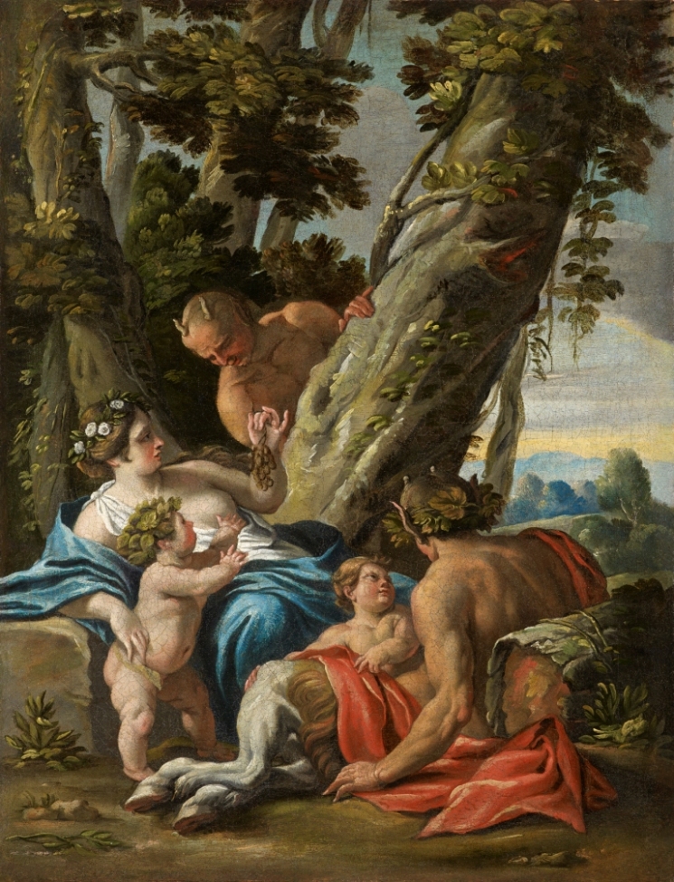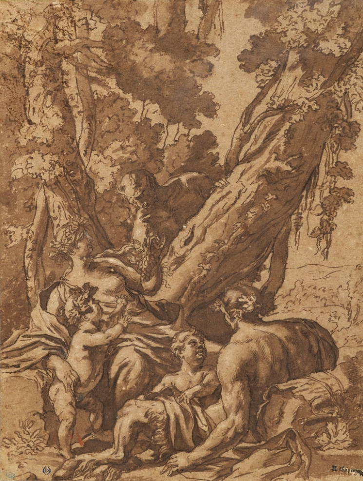 La mise en page de notre tableau et de son dessin préparatoire illustre les préoccupations de Chaperon, dont l’œuvre profane est majoritairement constituée de bacchanales. Librement issus des textes d’Ovide, ou du contemporain Giambattista Marino, ces sujets connaissaient au XVIIe siècle un vif succès.