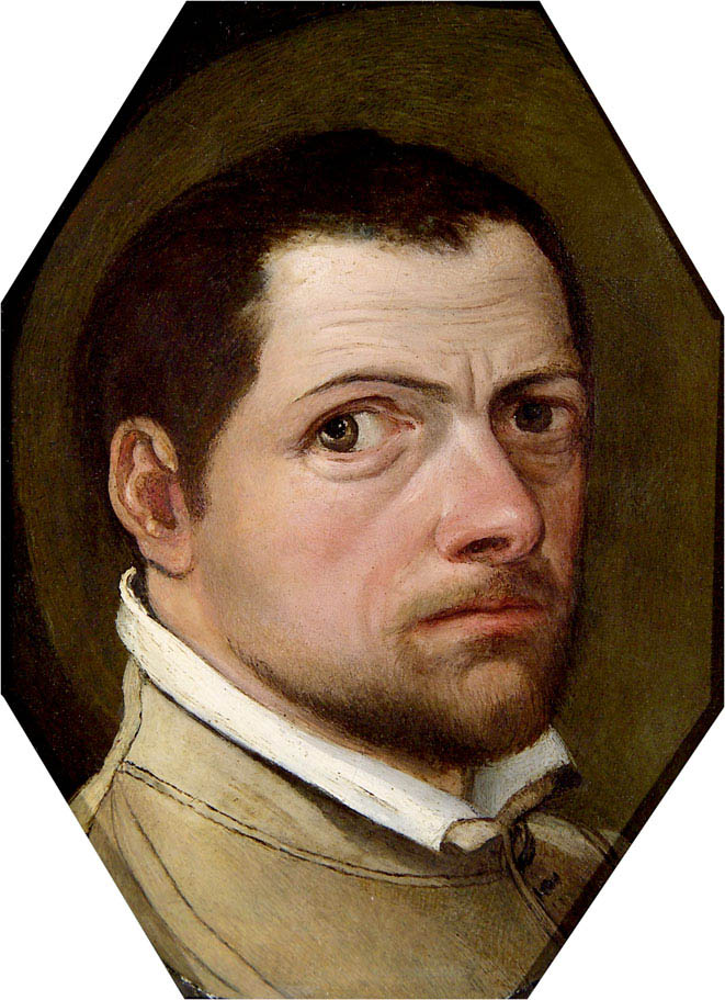 L’artiste reprend également un type physique récurent chez Passerotti : le portrait de trois quarts, d’un homme dans la force de l’âge, portant à la mode de l’époque une barbe coupée ras, les cheveux courts et le front large, les sourcils très dessinés sur un œil vif fixant le spectateur.