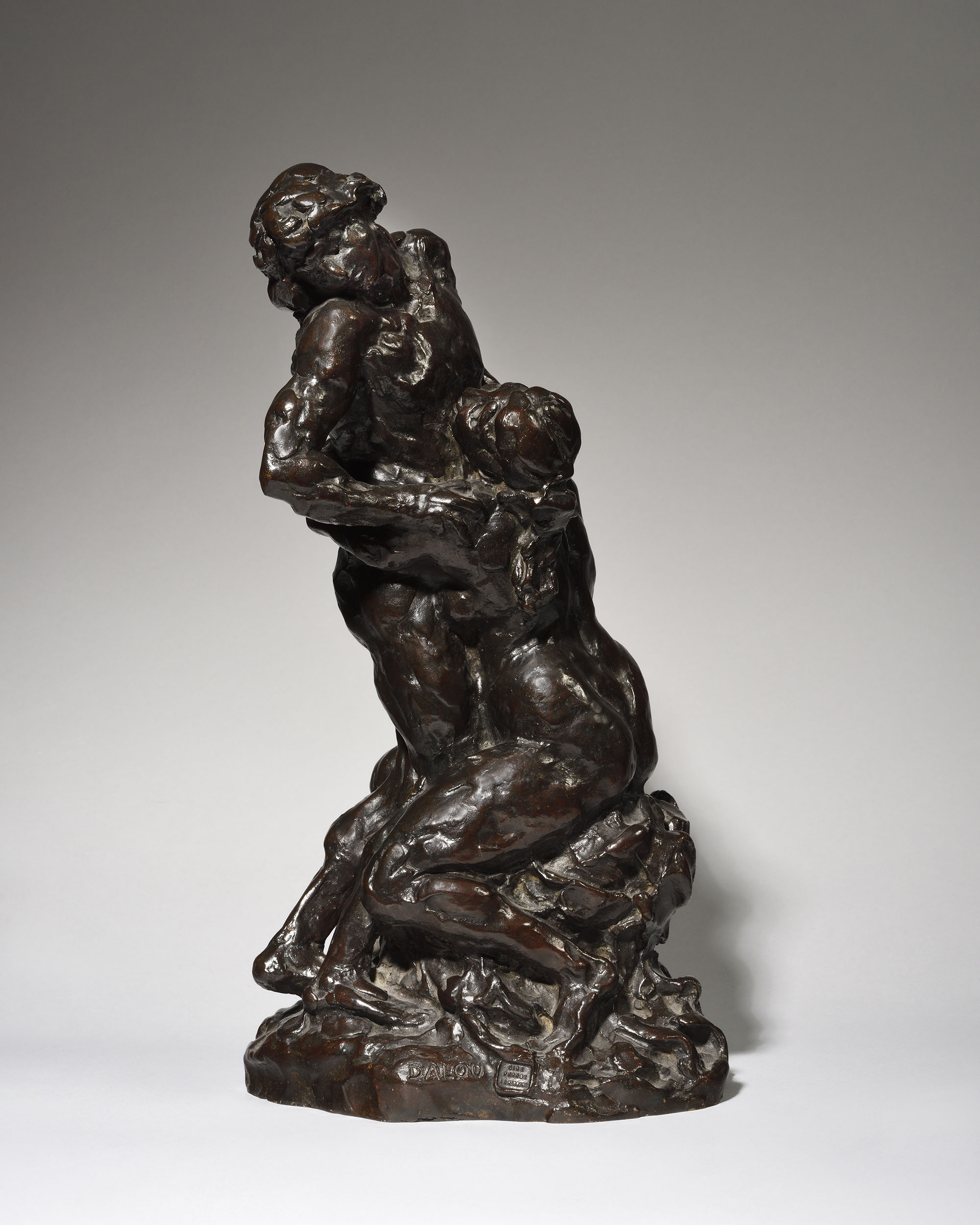 Dénommé L’Éloquence souffletant [giflant] le césarisme dans le projet de 1884, celui-ci devint La Sagesse soutenant la Liberté dans le monument bordelais tout en conservant la disposition de deux figures, l’une debout et l’autre agenouillée et s’affaissant. Bien plus expressive, notre Supplication paraît dépourvue de toute connotation allégorique complexe. Une jeune femme nue est assise sur un rocher. Elle enlace fermement un homme aux longs cheveux bouclés qui tente de se dégager de cette étreinte et détourne son regard du visage suppliant de sa compagne. Les poses tendues et déséquilibrées de l’homme et de la femme saisis dans un mouvement contraint tel un ressort, sont servies par un modelage vigoureux et une surface chaotique.
