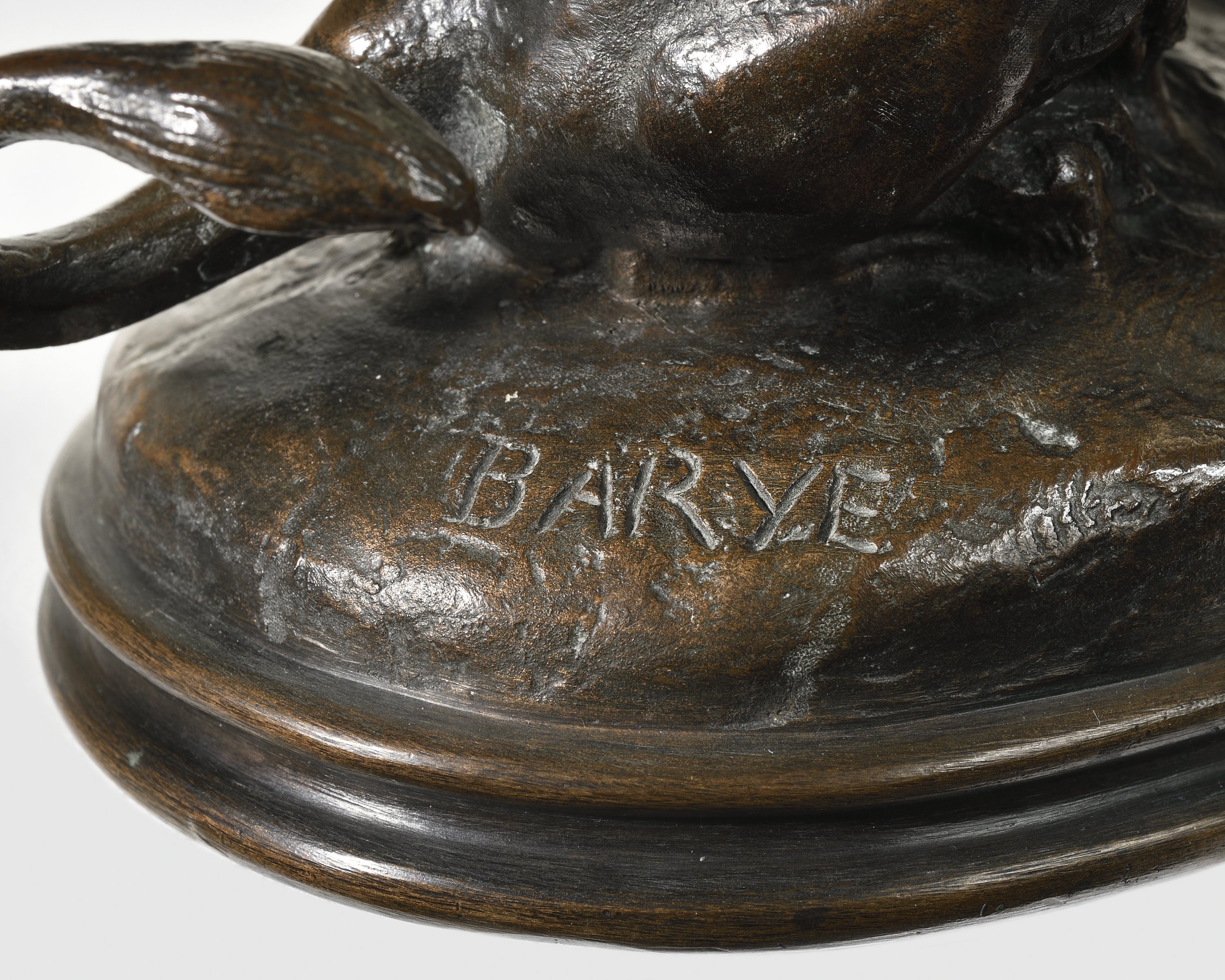 Bronze Signée BARYE à la base, estampée à froid AD sur le bord 17,78 cm (16,19 cm à la base) × 11,11 cm × 13,02 cm